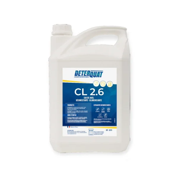 DETERQUAT CL 2.6 est une eau de Javel contenant 2,6% de chlore actif, spécialement formulée pour ses propriétés désinfectantes et blanchissantes. Idéale pour assurer une hygiène optimale sur diverses surfaces.